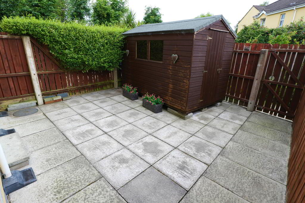 Fully enclosed rear laid in paving bounded by fencing with shed.