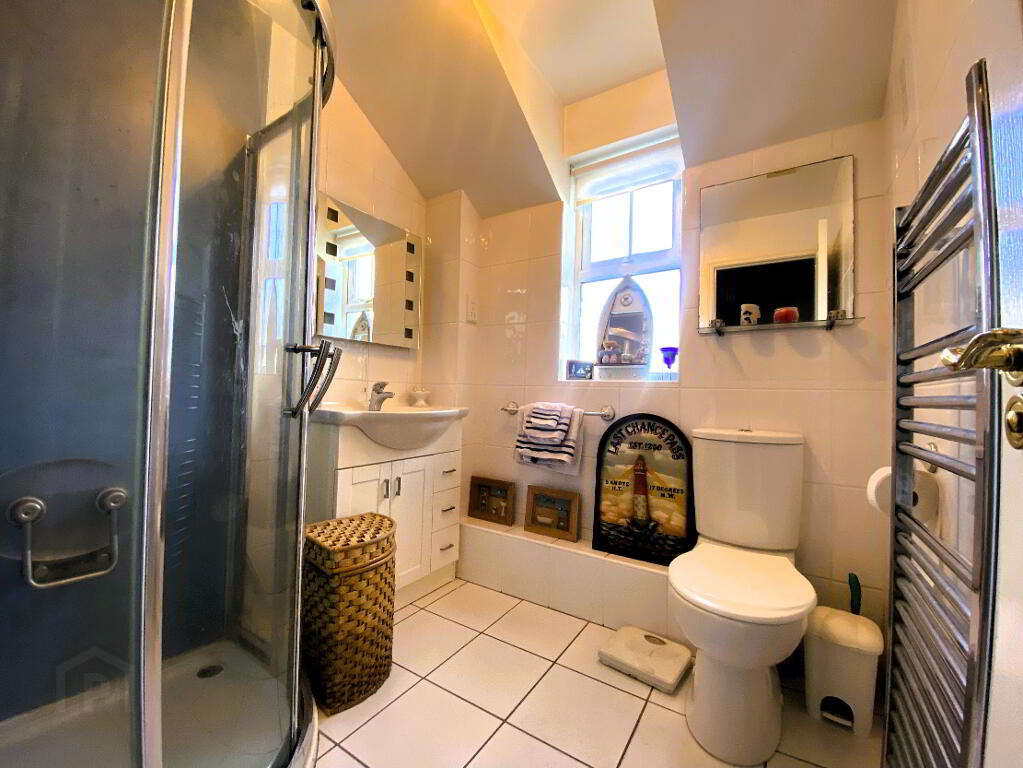 White suite comprising corner shower cubicle, low flush WC, wash hand basin in storage unit, chrome towel rail, window to rear aspect, part tiled walls, ceramic tiled flooring.