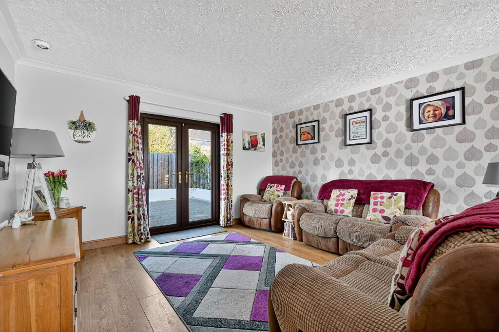 Lounge with feature multi fuel stove plus PVC patio doors to enclosed rear garden
