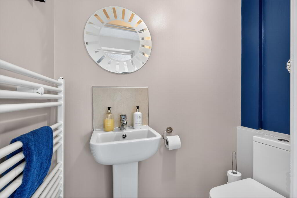 Low flush WC, pedestal wash hand basin, tiled flooring, towel rail.