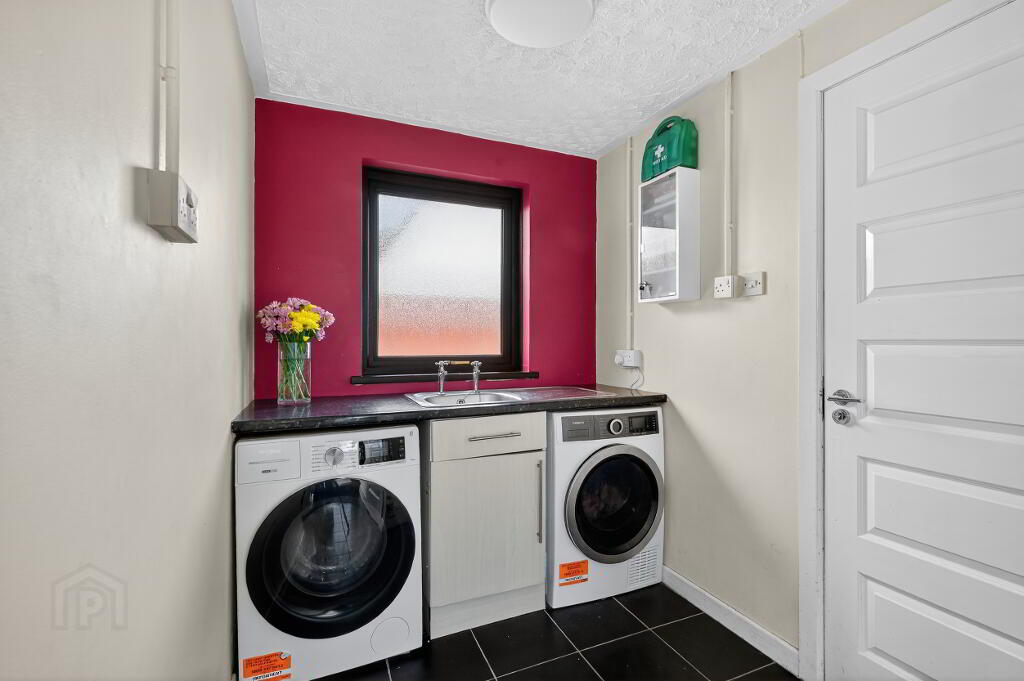 Fitted in a range of low level units with contrasting laminate work surfaces, inlaid single drainer sink unit with  mixer tap, plumbed for washing machine, recess for tumble dryer, PVC door to fully enclosed side aspect, internal door to garage, tiled flooring.