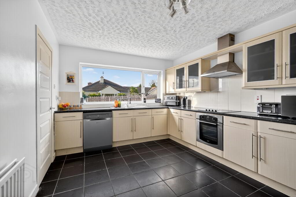 Fitted in a range of high and low level units with contrasting laminate work surfaces, inlaid 1½ bowl stainless steel sink unit with mixer tap, integrated oven, hob and stainless steel extractor fan, recess for fridge, plumbed for dishwasher, tiled flooring, window to enclosed rear.