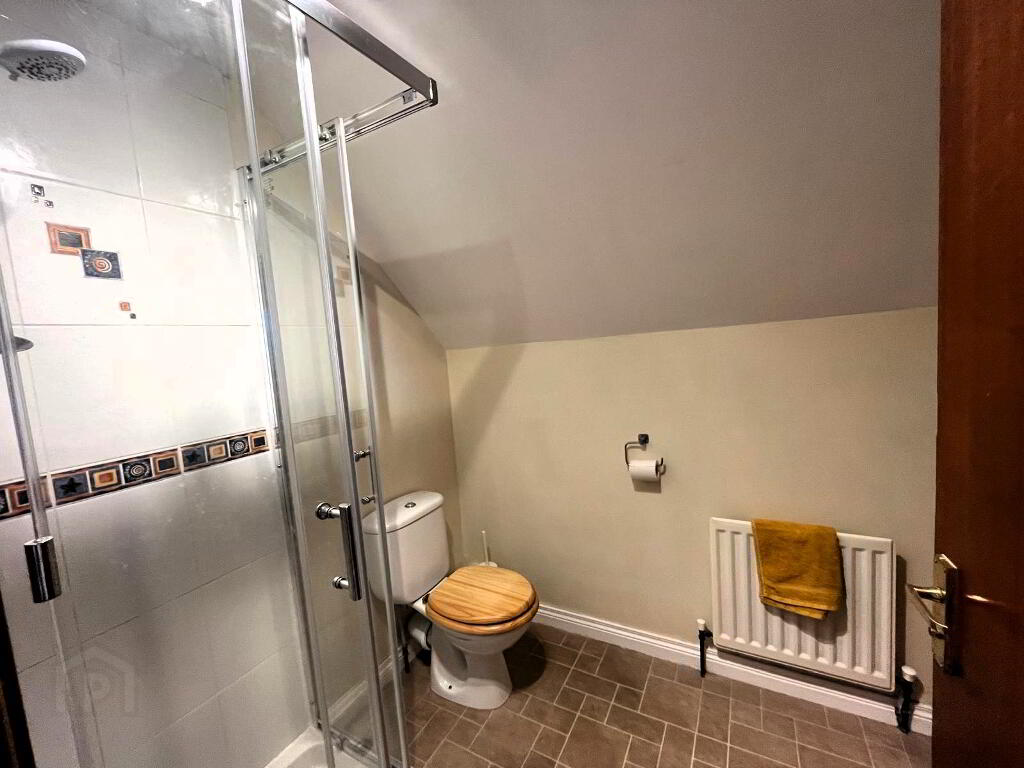 Low flush WC, shower cubicle with electric shower, pedestal wash hand basin with mixer tap.