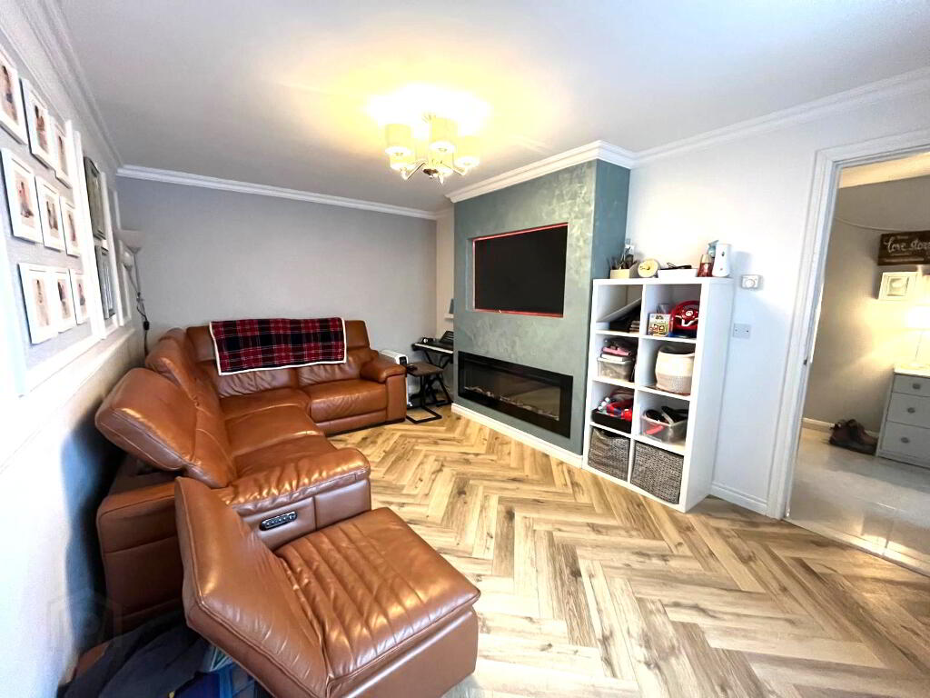 Feature electric wall fire, herringbone wood flooring, window to front aspect.