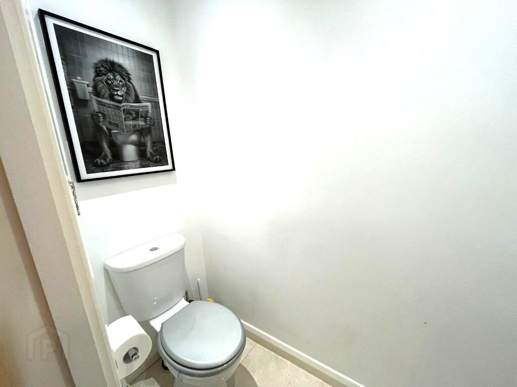 Low flush WC, wash hand basin with mixer tap, porcelain floor tiling.