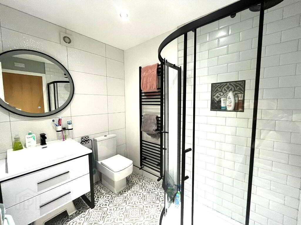 White suite comprising of walk in shower cubicle, tiled flooring, wash hand basin with mixer tap.
