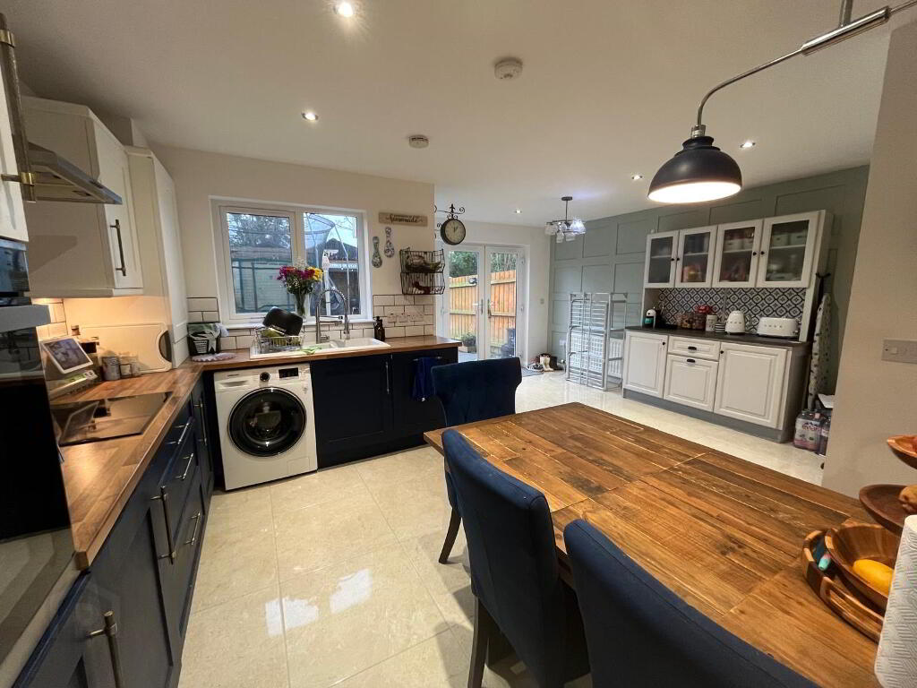 Fitted in a range of high and low level units with contrasting laminate work surfaces, inlaid sink unit with mixer tap, integrated oven, window to rear aspect, french doors to rear.
