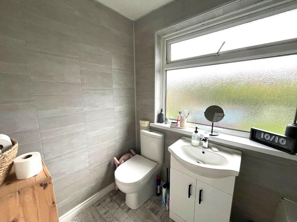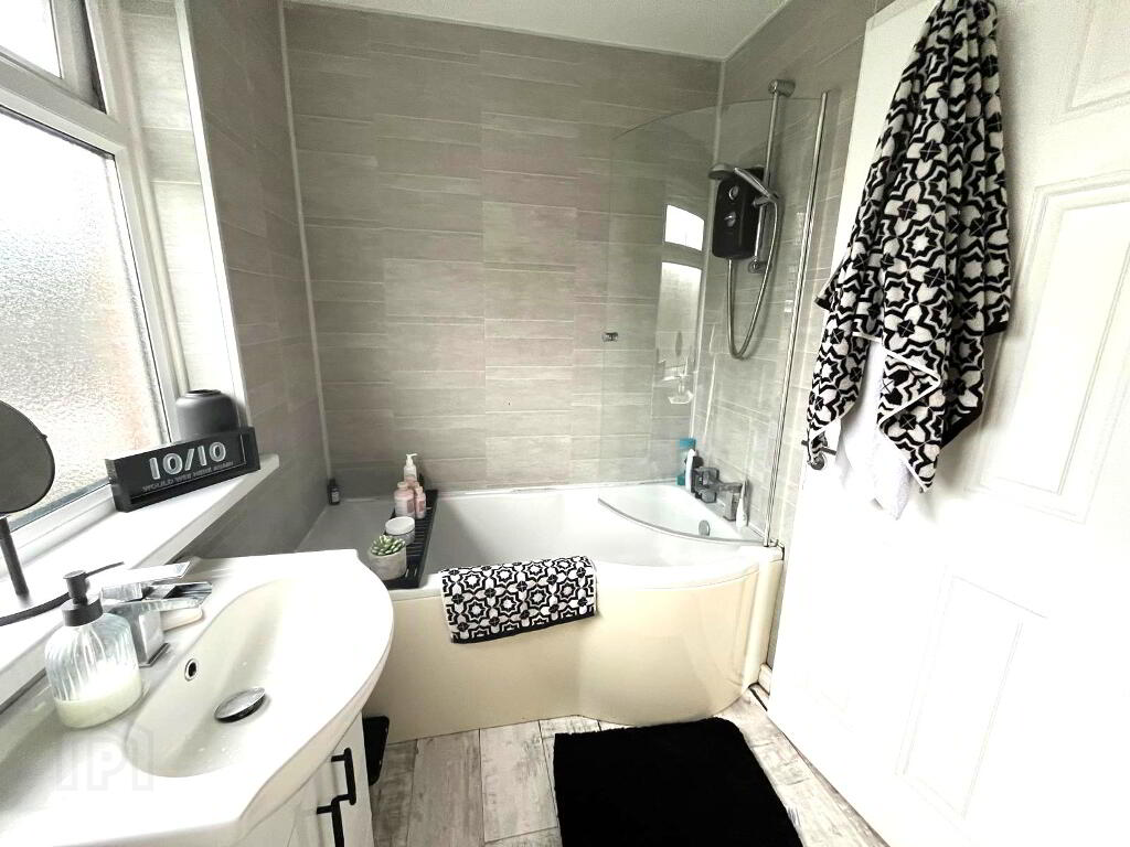 White suite comprising panelled bath with electric shower over, vanity unit with mixer tap, window to rear aspect, low flush WC, laminate wood flooring.