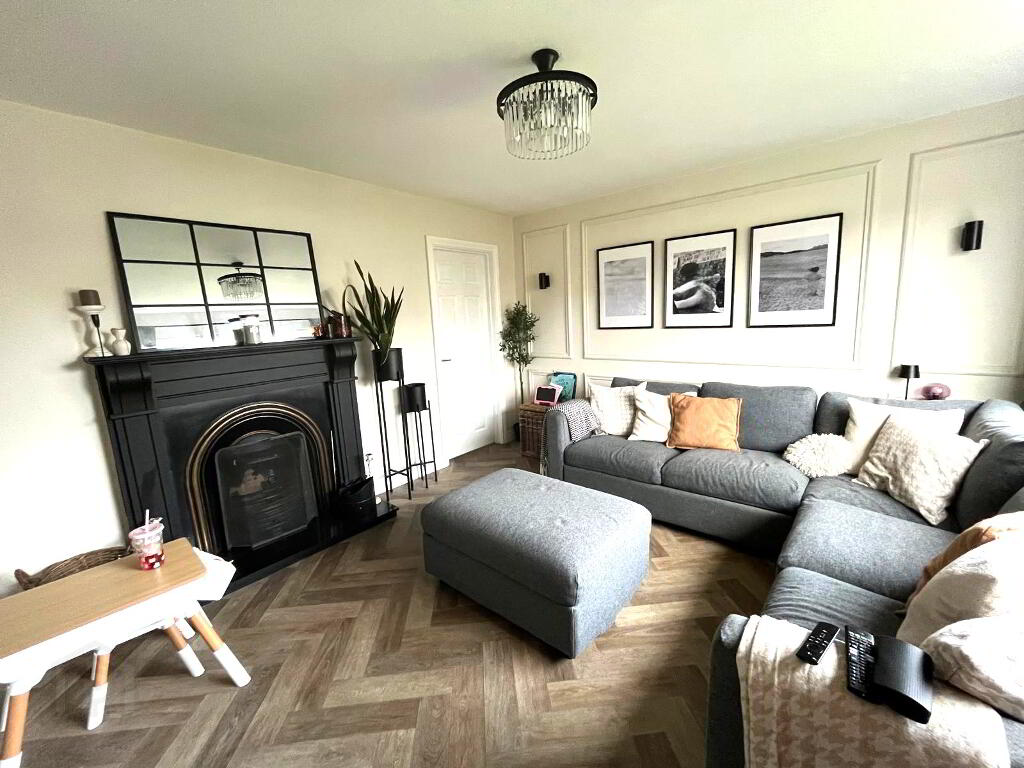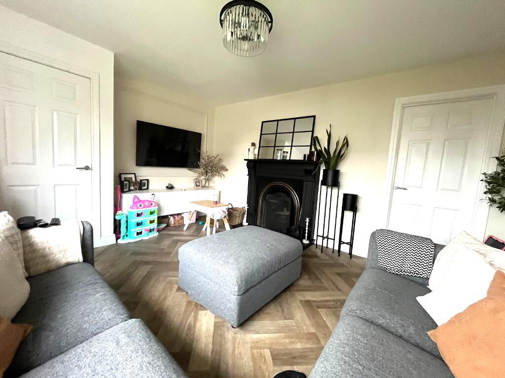 Feature fireplace with open fire, vinyl flooring, large picture window to front aspect.