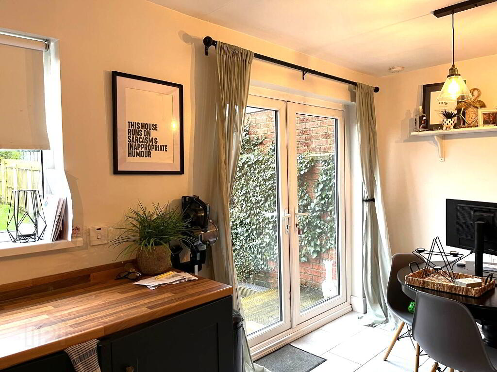 Fitted in a range of high and low level cream and navy units with contrasting laminate work surfaces, inlaid single drainer sink unit with mixer tap, integrated hob and oven, window to rear aspect, french door and window to rear aspect.