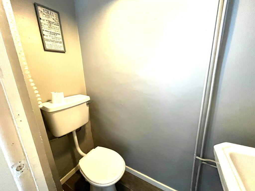 White suite comprising low flush WC, pedestal wash hand basin, laminate wood flooring.