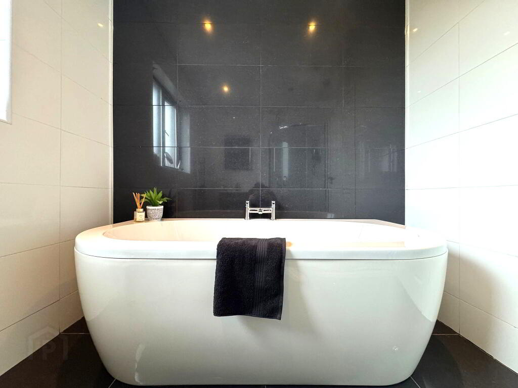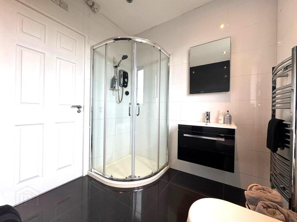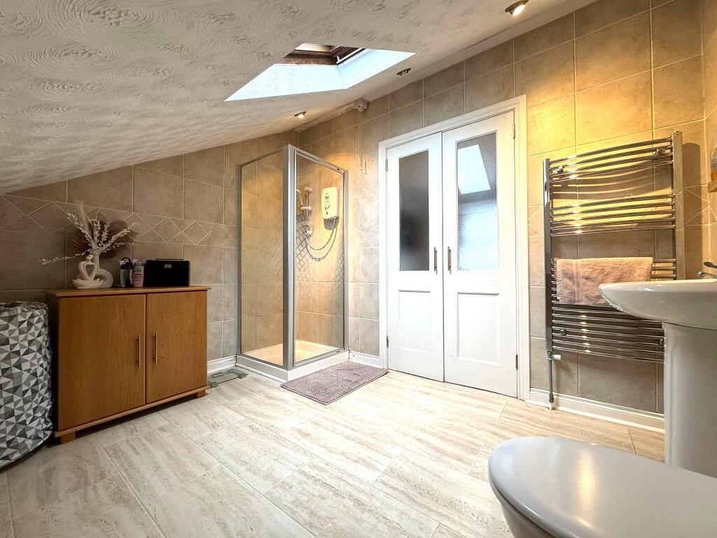 Fully tiled shower cubicle, low flush WC, wash hand basin, towel rail, tiled flooring, velux to front aspect.