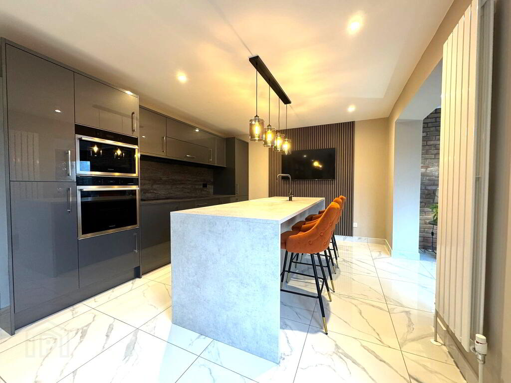 kettle tap, integrated hob oven and extractor, microwave, dishwasher and fridge/freezer, island unit with breakfast bar area, tiled flooring, window to rear aspect.