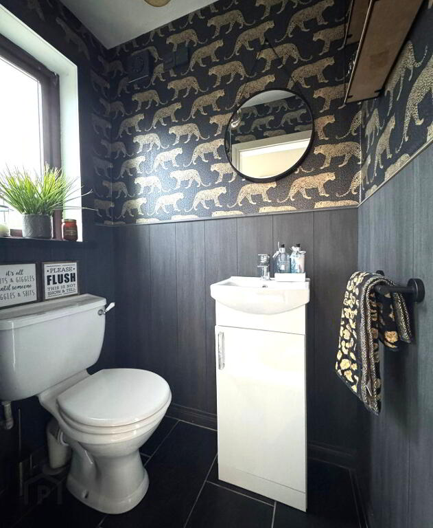 wash hand basin with mixer tap, low flush WC, window to rear aspect, fully tiled walls, tiled flooring.