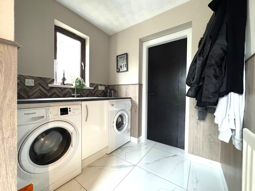Fitted in a range of low level units with contrasting work surfaces, sink unit with mixer tap, window to side aspect, access to garage, door to rear, plumbed for washing machine, tiled flooring.