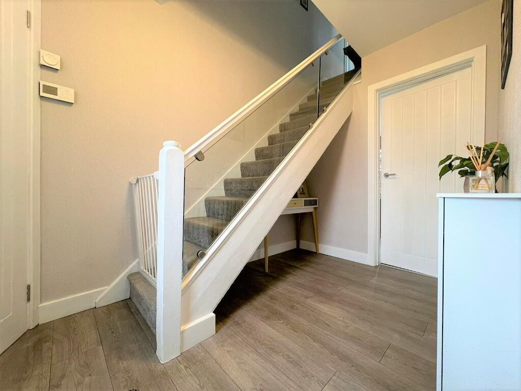 PVC entrance door, stairs to first floor, storage cupboard, laminate wood flooring.