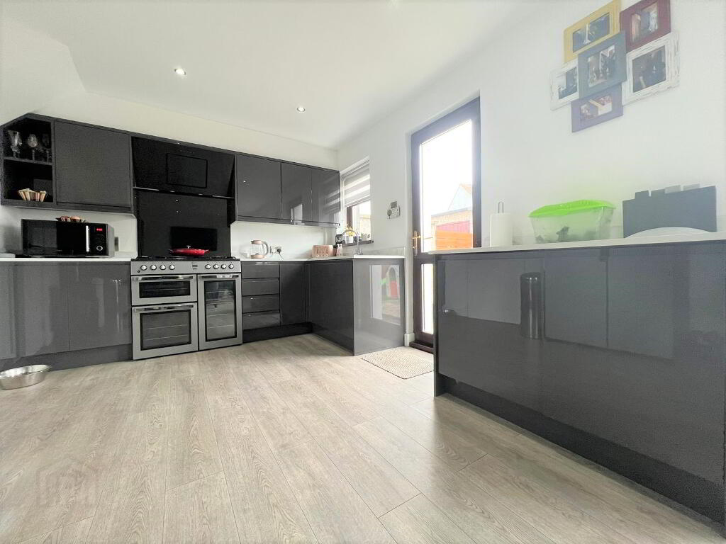 Fitted in a range of high and low level Grey fronted units with contrasting laminate work surfaces, single drainer sink unit with mixer tap, extractor fan, window and door to rear aspect, storage, laminate wood flooring.