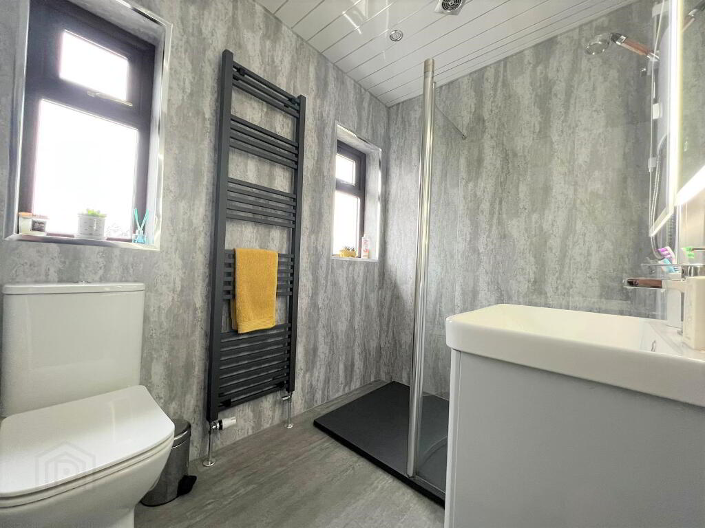 White suite comprising of walk in shower cubicle, was hand basin with mixer tap, low flush WC, towel rail, windows to rear aspects, tile effect laminate wood flooring.