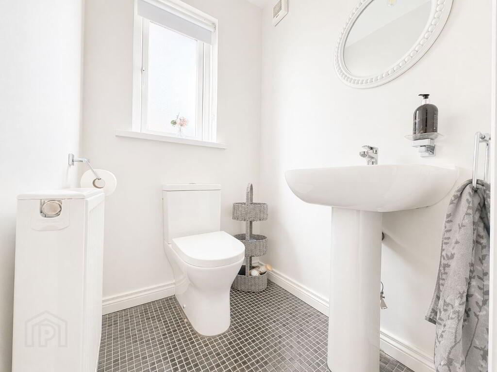 White suite comprising low flush WC, pedestal wash hand basin with mixer tap, window to side aspect, tiled flooring.