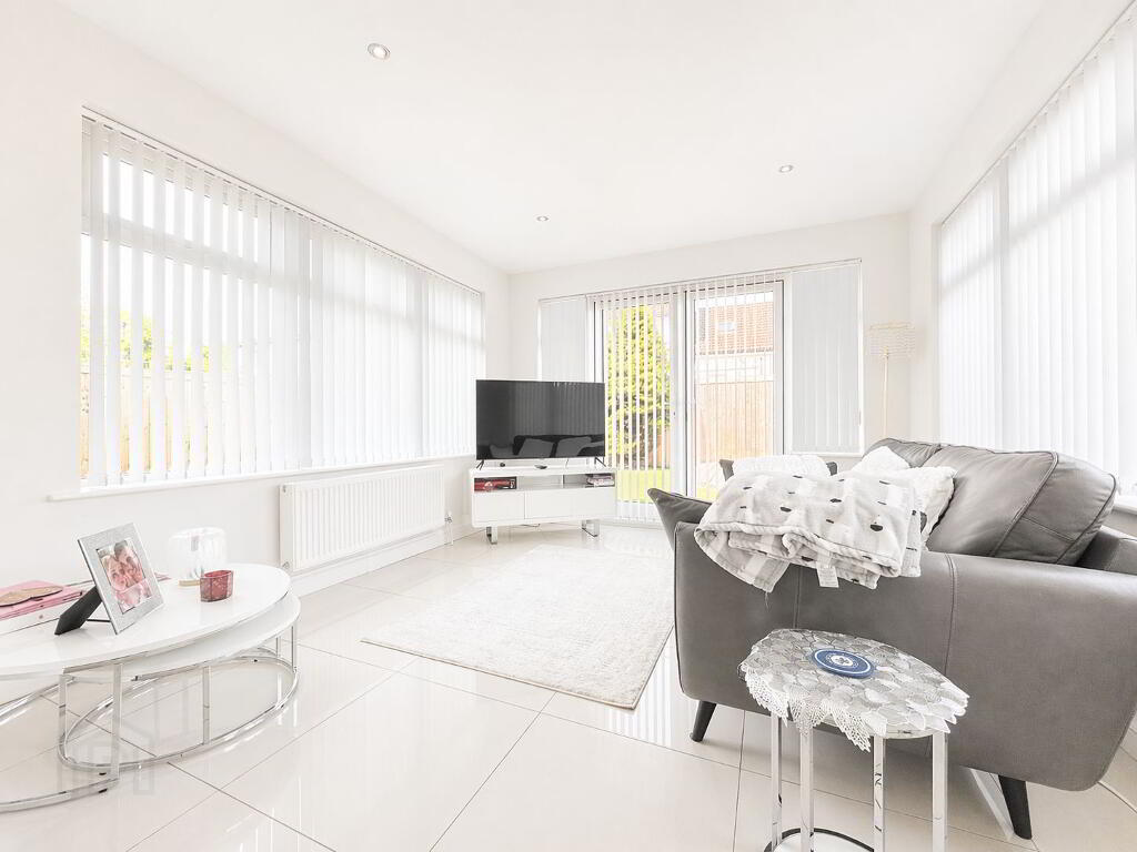 Polished porcelain floor tiling, PVC patio doors to enclosed rear garden.