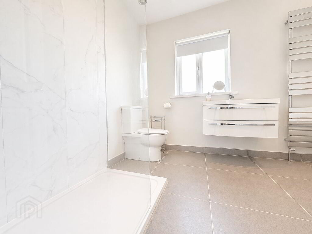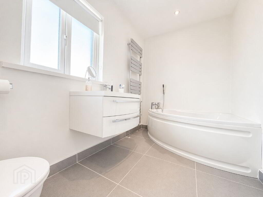White 4 piece suite comprising corner panelled bath with mixer tap and shower attachment, separate double shower cubicle, wash hand basin with mixer tap, low flush WC, window to rear aspect, tiled flooring.